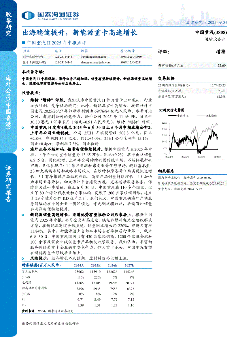 中国重汽:国泰海通证券-中国重汽-3808.HK-2025年中报点评:出海稳健提升,新能源重卡高速增长-250903