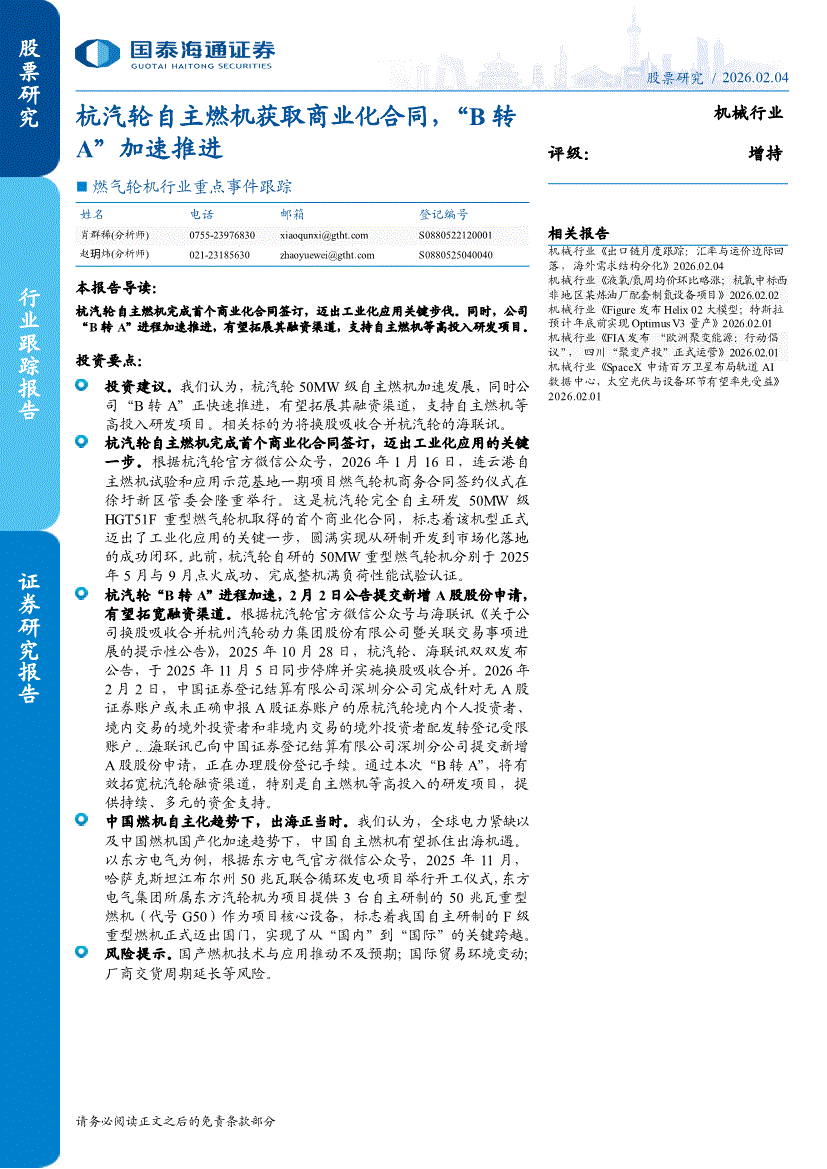 机械行业:国泰海通证券-燃气轮机行业重点事件跟踪:杭汽轮自主燃机获取商业化合同,“B转A”加速推进-260204