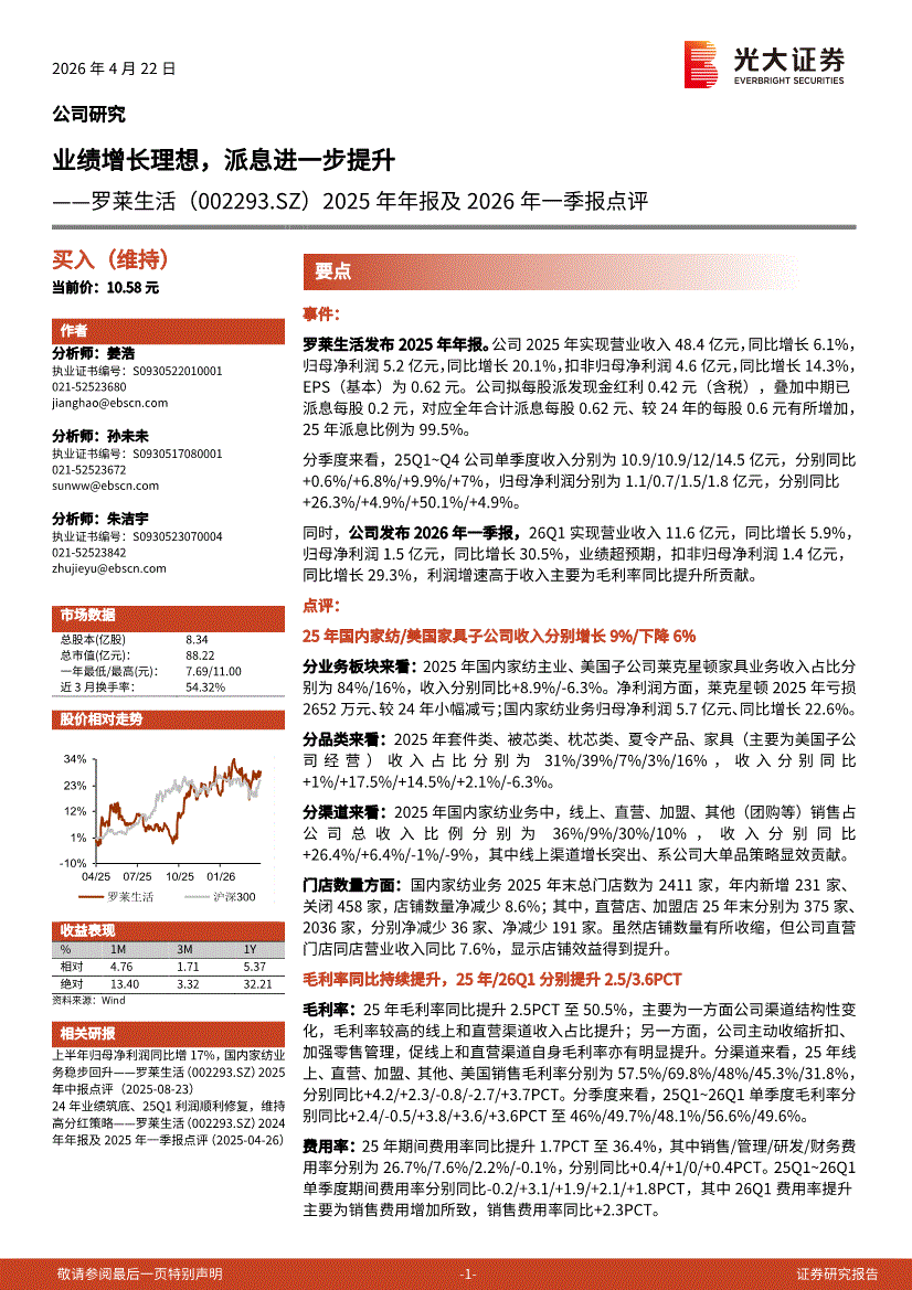 罗莱生活:光大证券-罗莱生活-002293-2025年年报及2026年一季报点评:业绩增长理想,派息进一步提升-260422