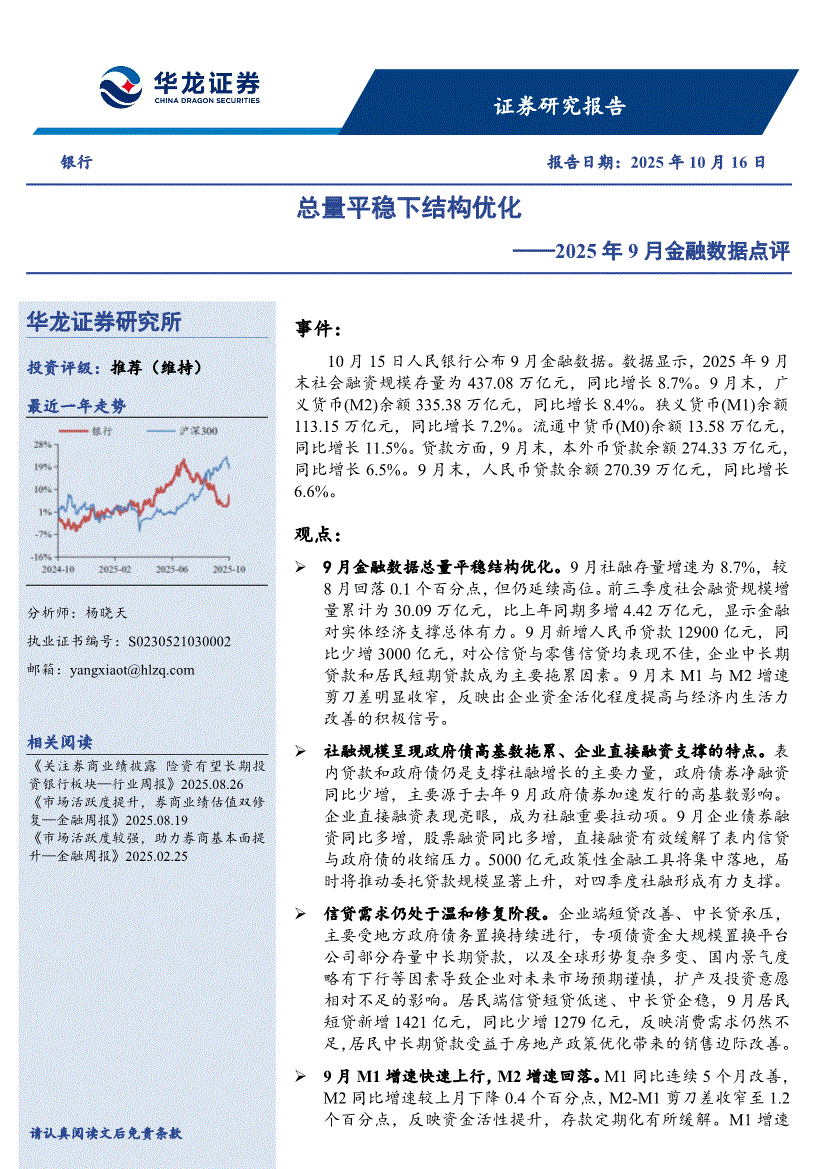 银行业:华龙证券-银行业2025年9月金融数据点评:总量平稳下结构优化-251016