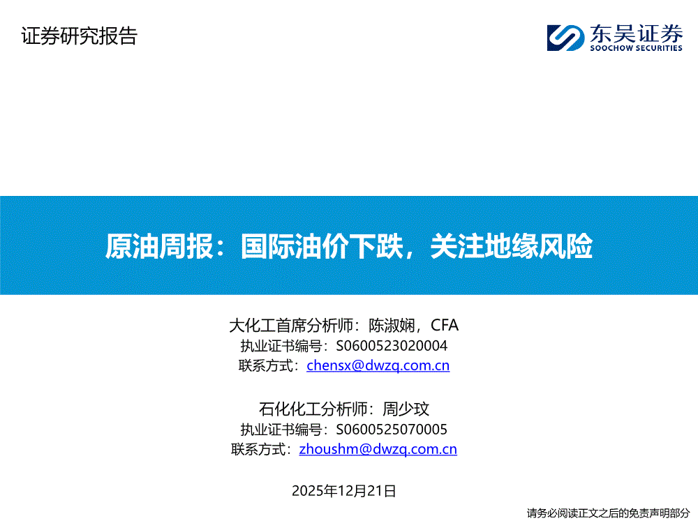 石化化工行业:东吴证券-石化化工行业原油周报:国际油价下跌,关注地缘风险-251221