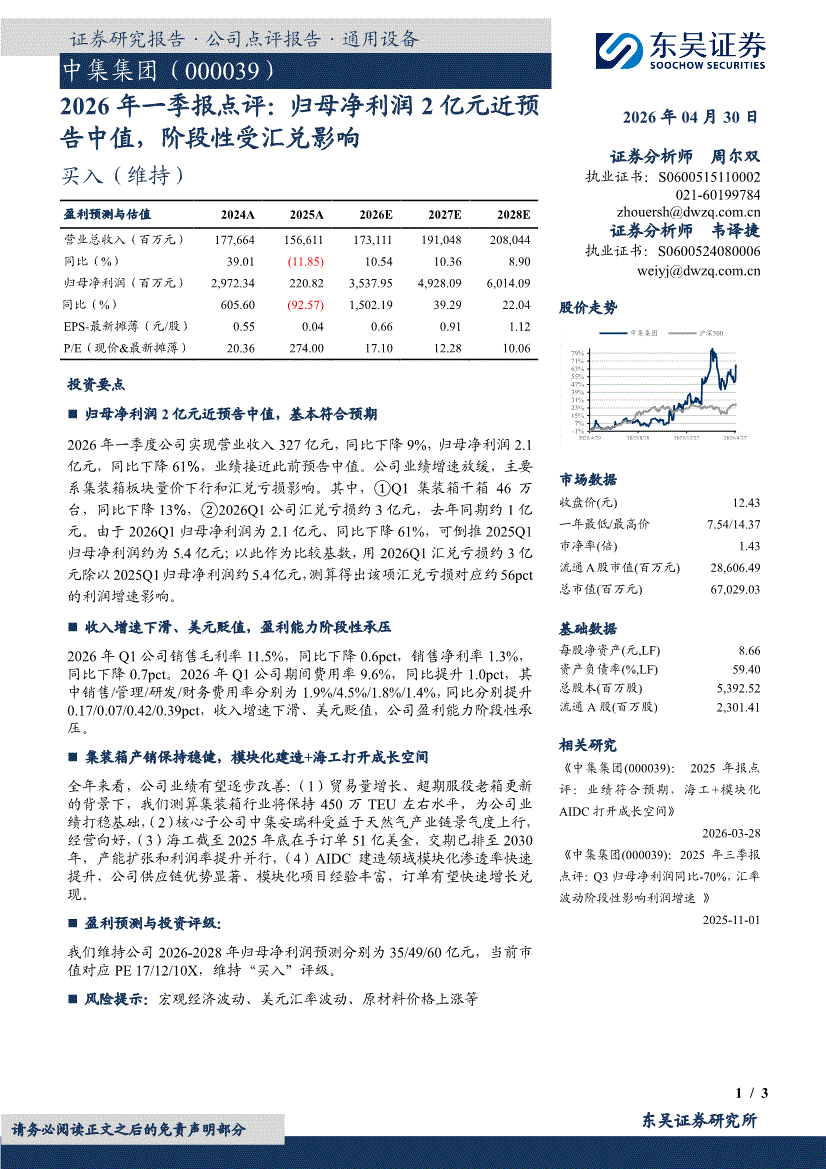 中集集团:东吴证券-中集集团-000039-2026年一季报点评:归母净利润2亿元近预告中值,阶段性受汇兑影响-260430