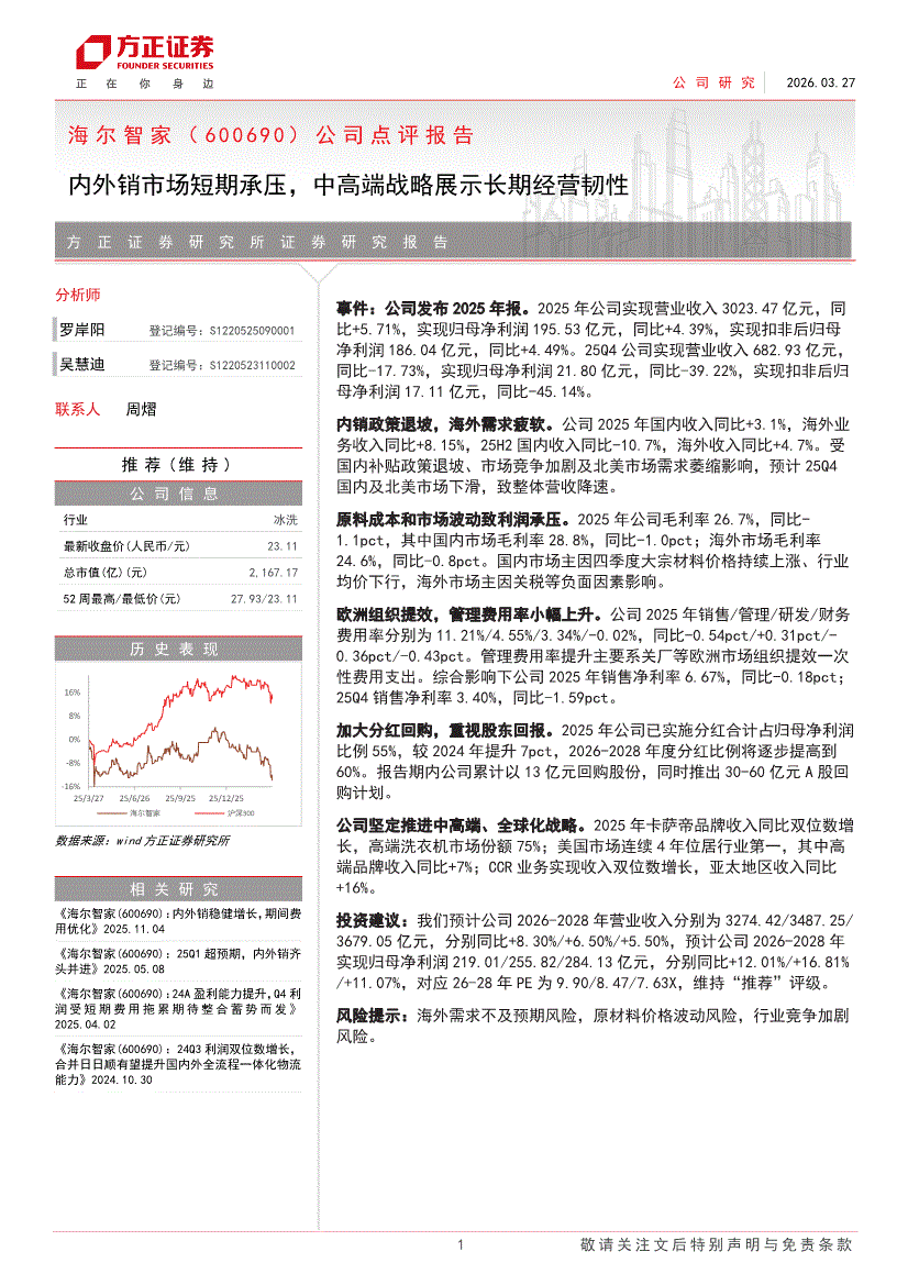 海尔智家:方正证券-海尔智家-600690-公司点评报告:内外销市场短期承压,中高端战略展示长期经营韧性-260327