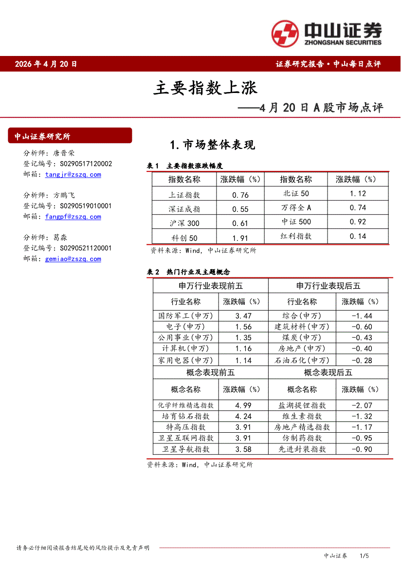 中山证券-4月20日A股市场点评:主要指数上涨-260420