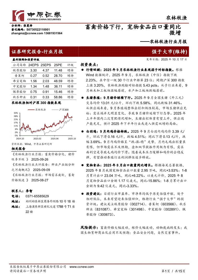 农林牧渔行业:中原证券-农林牧渔行业月报:畜禽价格下行,宠物食品出口量同比微增-251017
