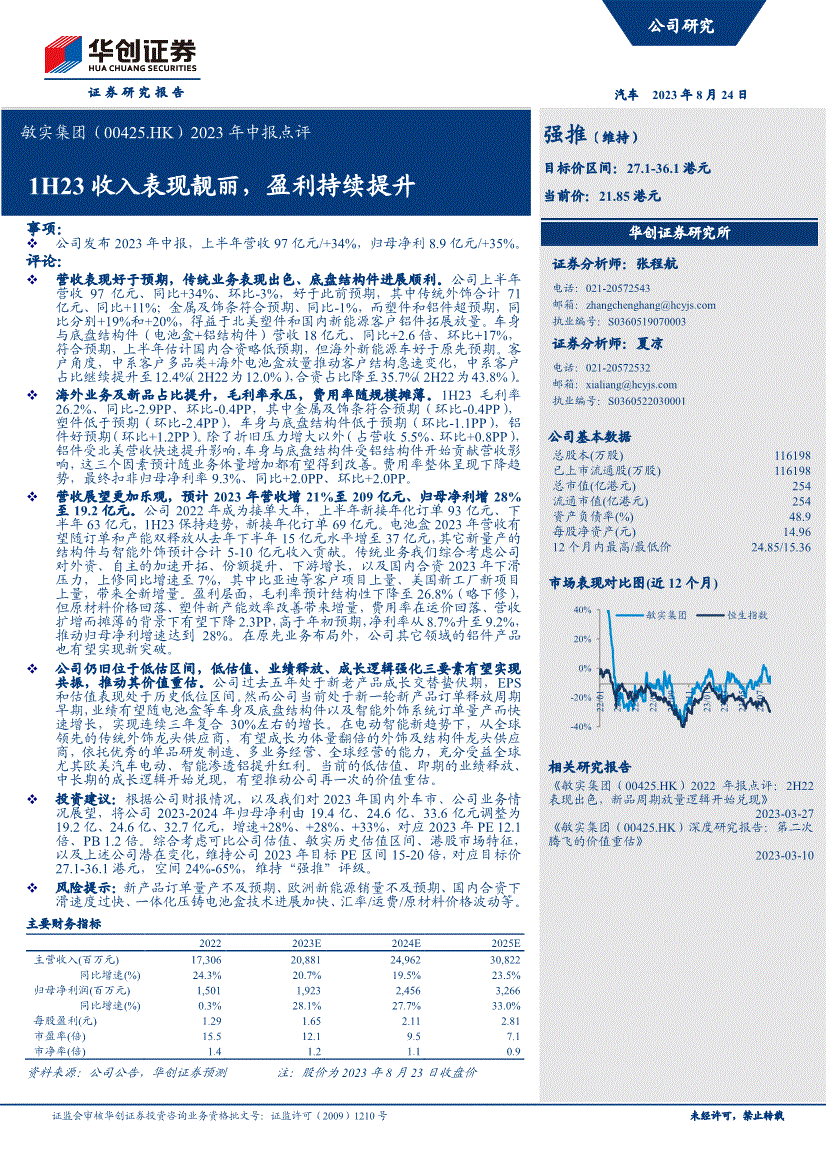 敏实集团:华创证券-敏实集团-0425.HK-2023年中报点评:1H23收入表现靓丽,盈利持续提升-230824