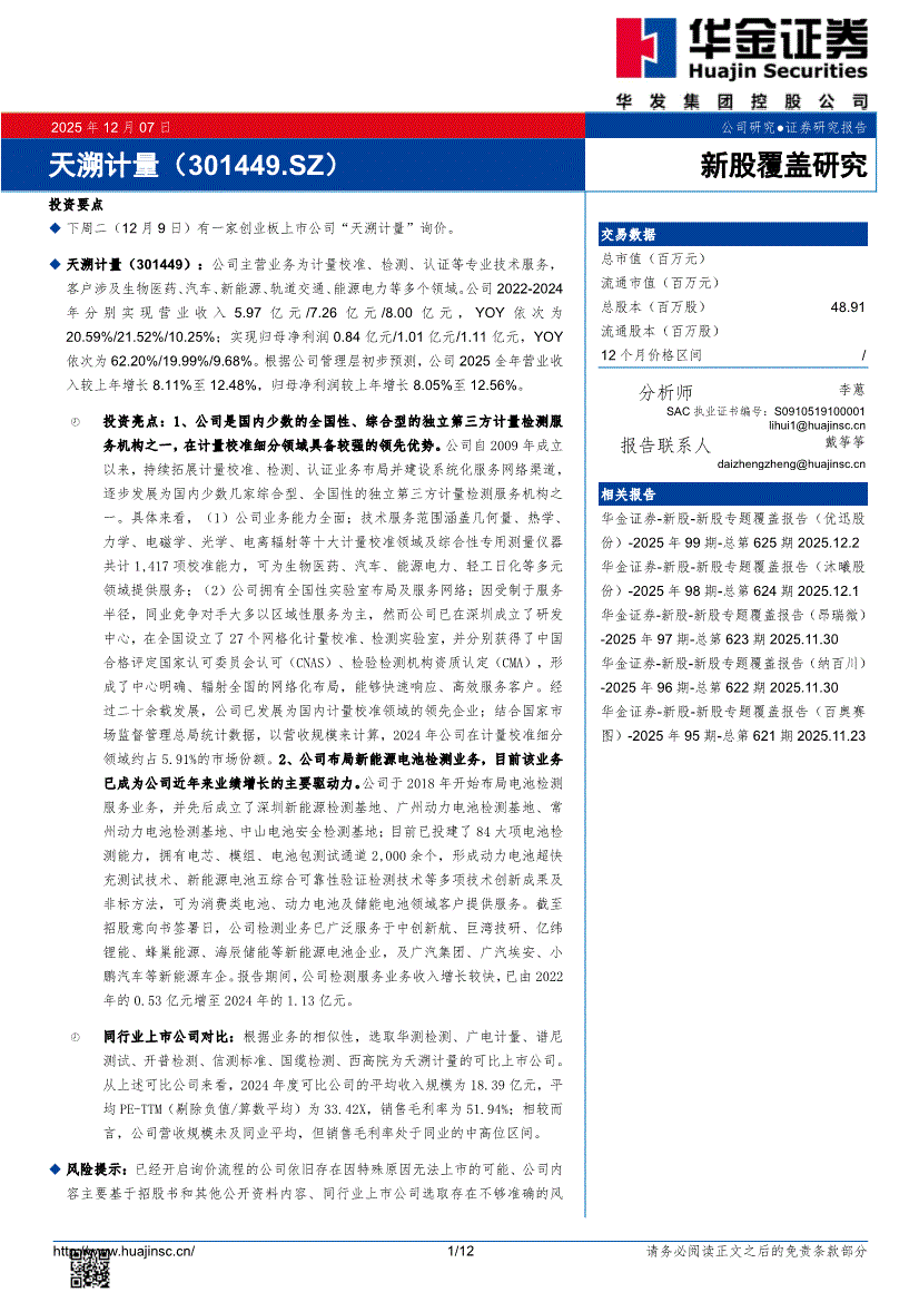 天溯计量:华金证券-天溯计量-301449-新股覆盖研究-251207