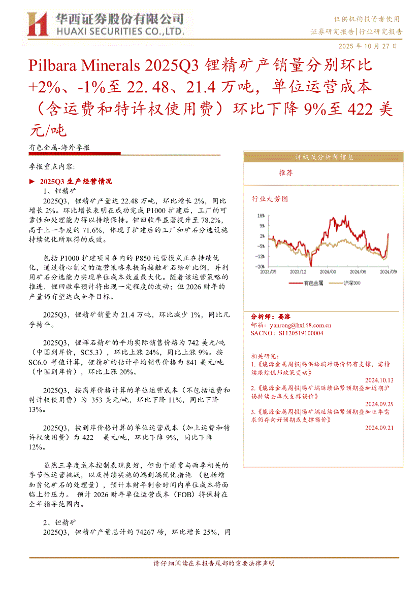 有色金属行业:华西证券-有色金属行业~海外季报:Pilbara Minerals 2025Q3锂精矿产销量分别环比+2%、下降1%至22.48、21.4万吨,单位运营成本(含运费和特许权使用费)环比下降9%至422美元/吨-251027