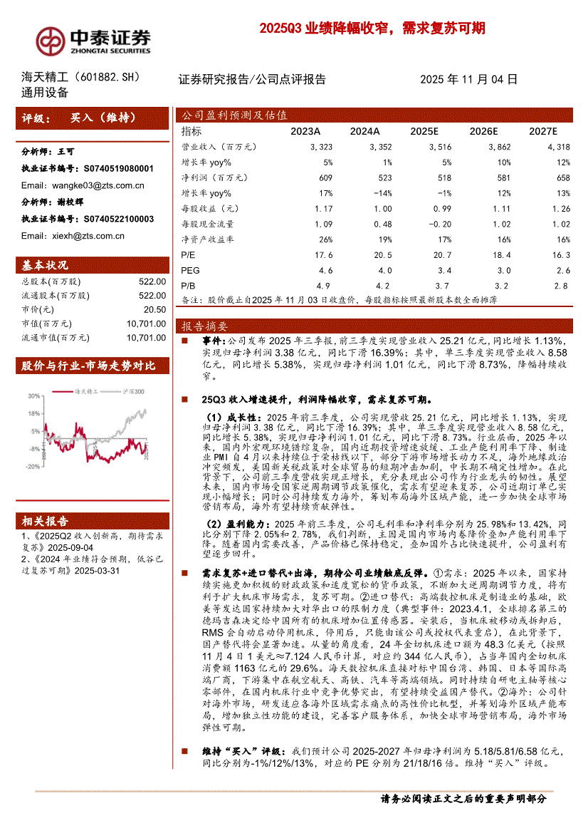 海天精工:中泰证券-海天精工-601882-2025Q3业绩降幅收窄,需求复苏可期-251104