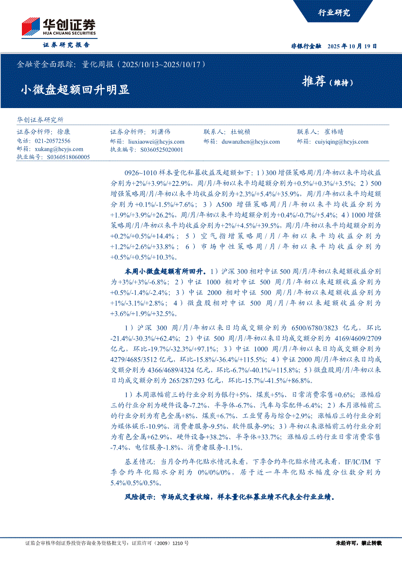 非银行金融行业:华创证券-金融行业资金面跟踪,量化周报:小微盘超额回升明显-251019