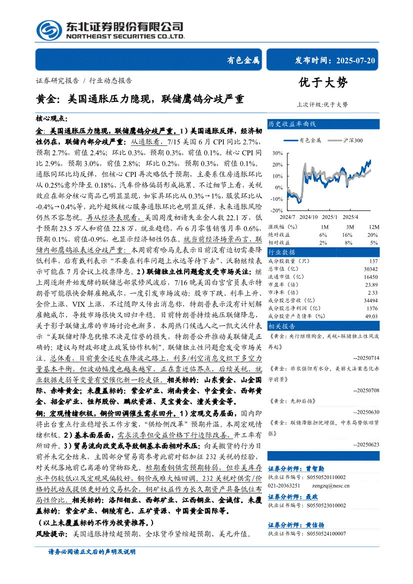 有色金属行业:东北证券-有色金属行业:黄金,美国通胀压力隐现,联储鹰鸽分歧严重-250720