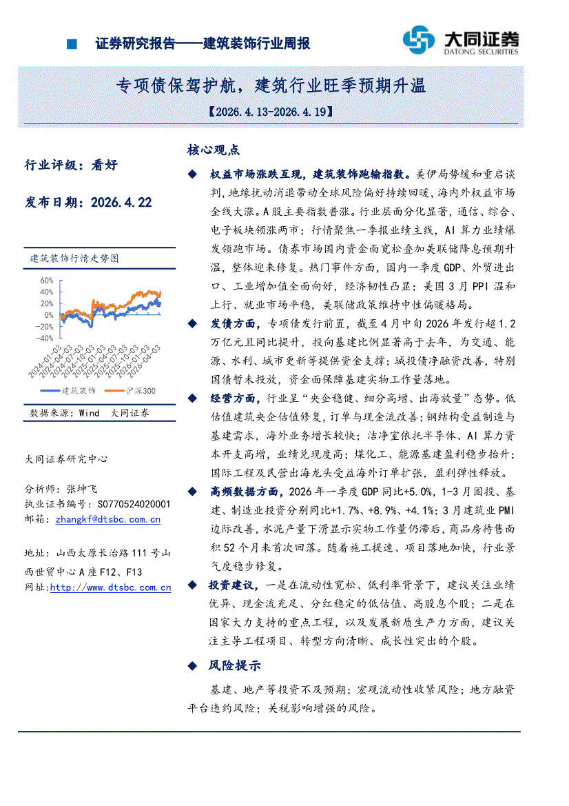 建筑装饰行业:大同证券-建筑装饰行业周报:专项债保驾护航,建筑行业旺季预期升温-260422