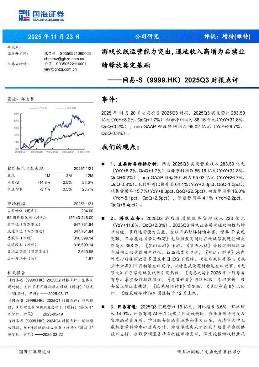 网易~S:国海证券-网易~S-9999.HK-2025Q3财报点评:游戏长线运营能力突出,递延收入高增为后续业绩释放奠定基础-251123