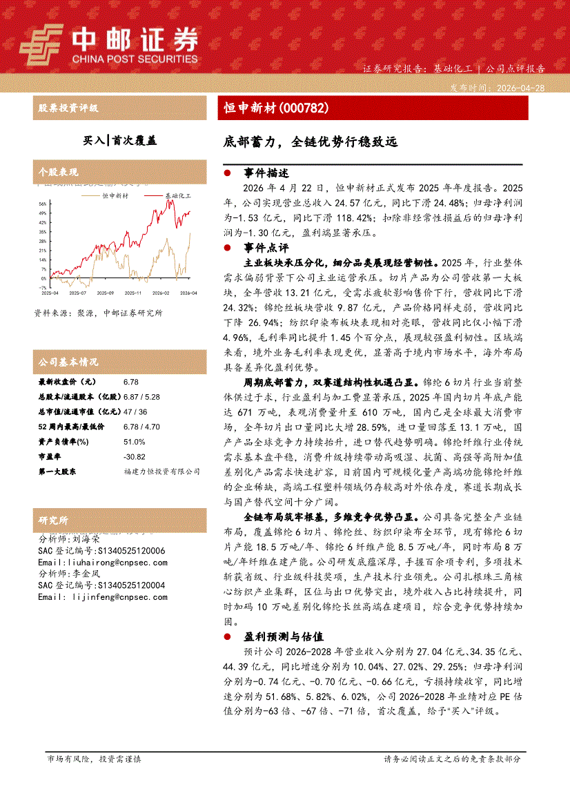恒申新材:中邮证券-恒申新材-000782-底部蓄力,全链优势行稳致远-260428