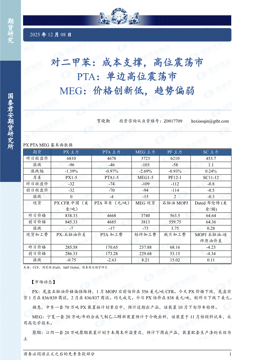 国泰君安期货-对二甲苯:成本支撑,高位震荡市,PTA,单边高位震荡市,MEG,价格创新低,趋势偏弱-251208