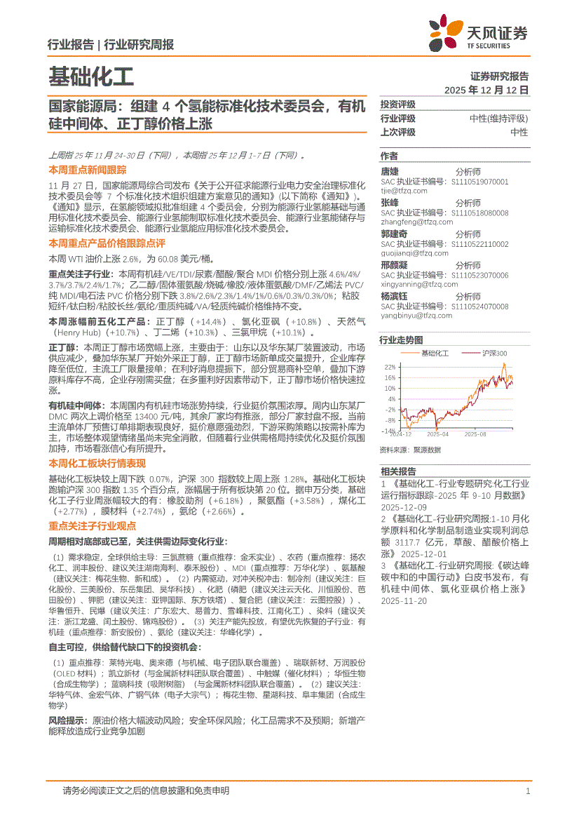 基础化工行业:天风证券-基础化工行业周报:国家能源局,组建4个氢能标准化技术委员会,有机硅中间体、正丁醇价格上涨-251212