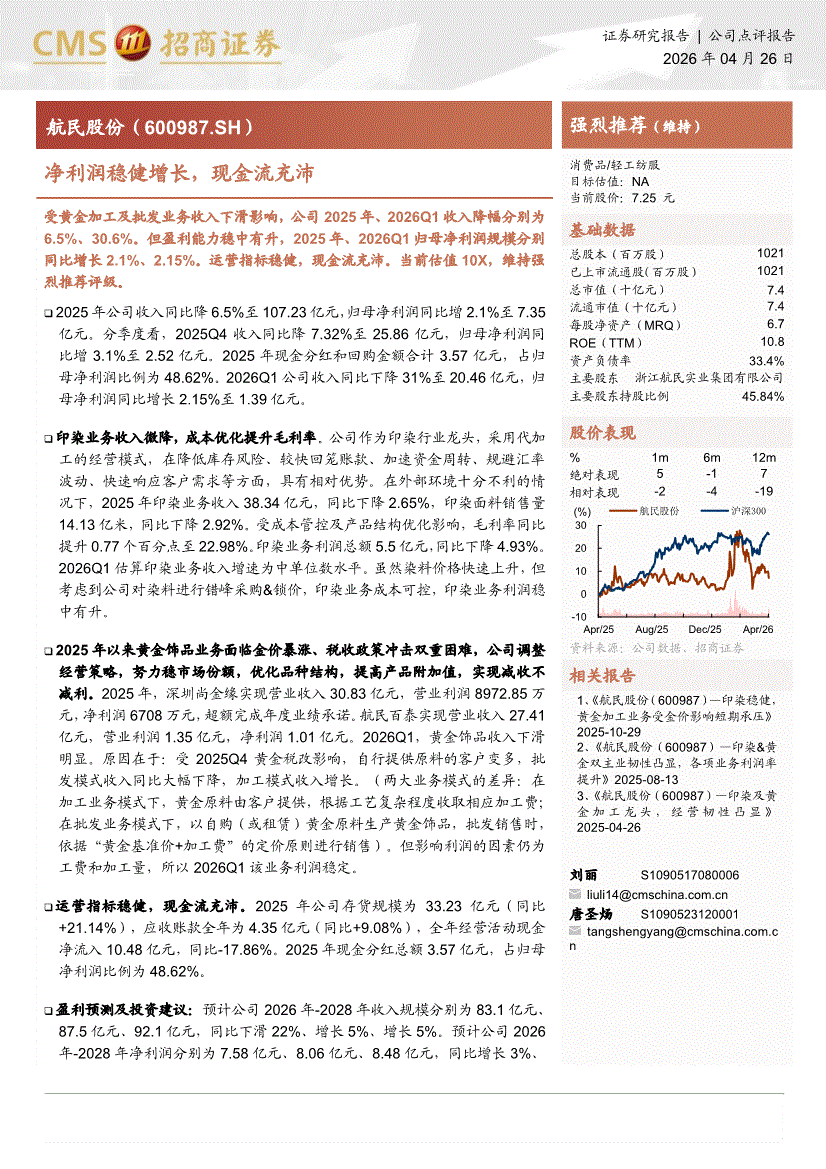 航民股份:招商证券-航民股份-600987-净利润稳健增长,现金流充沛-260426