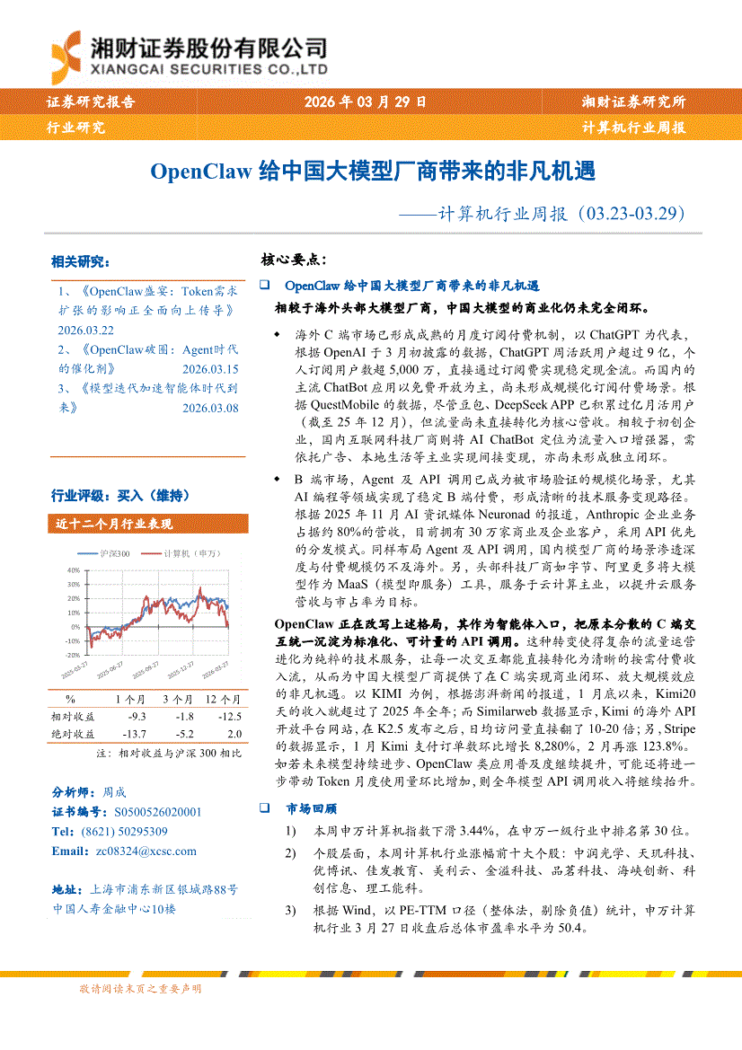 计算机行业:湘财证券-计算机行业周报:OpenClaw给中国大模型厂商带来的非凡机遇-260329