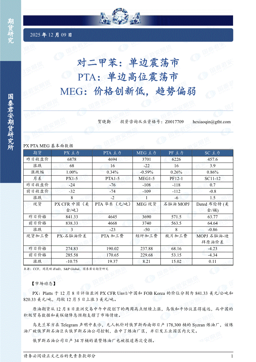 国泰君安期货-对二甲苯:单边震荡市,PTA,单边高位震荡市,MEG,价格创新低,趋势偏弱-251209