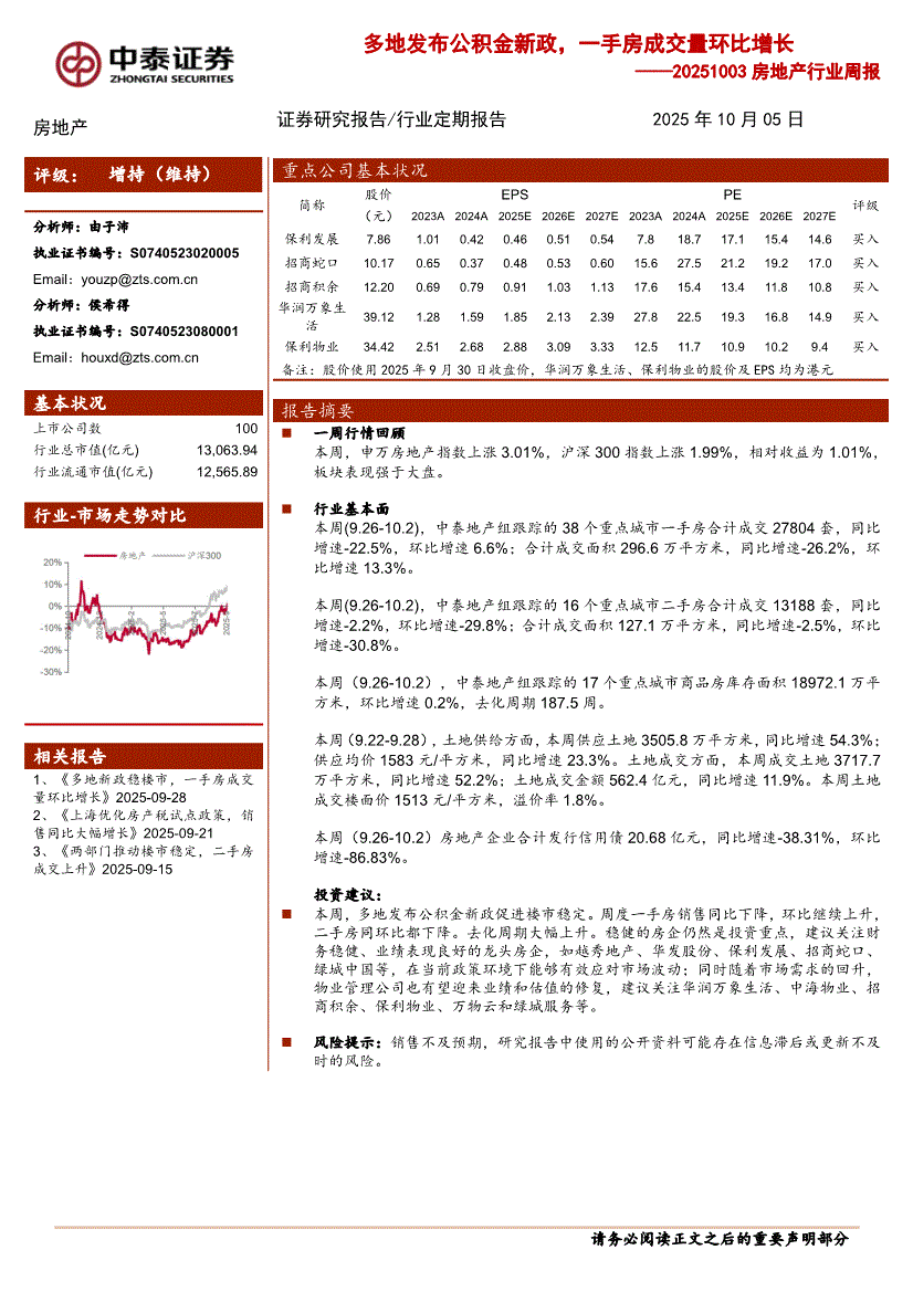 房地产行业:中泰证券-房地产行业周报:多地发布公积金新政,一手房成交量环比增长-251005