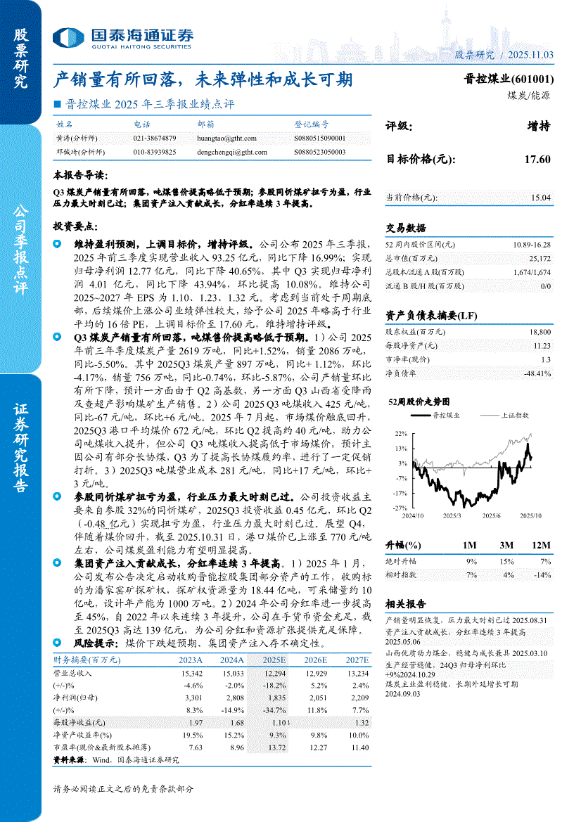 晋控煤业:国泰海通证券-晋控煤业-601001-2025年三季报业绩点评:产销量有所回落,未来弹性和成长可期-251103