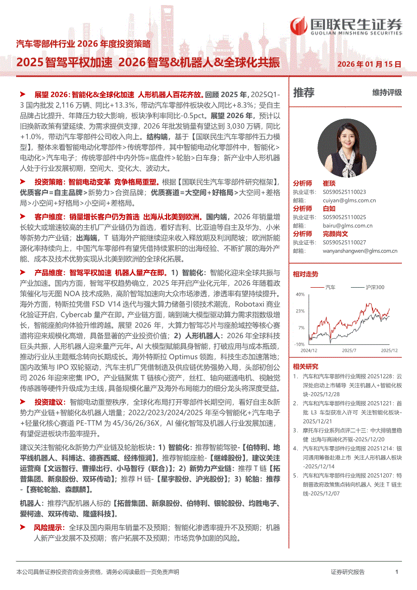 汽车零部件行业:国联民生证券-汽车零部件行业2026年度投资策略:2025智驾平权加速,2026智驾&机器人&全球化共振-260115