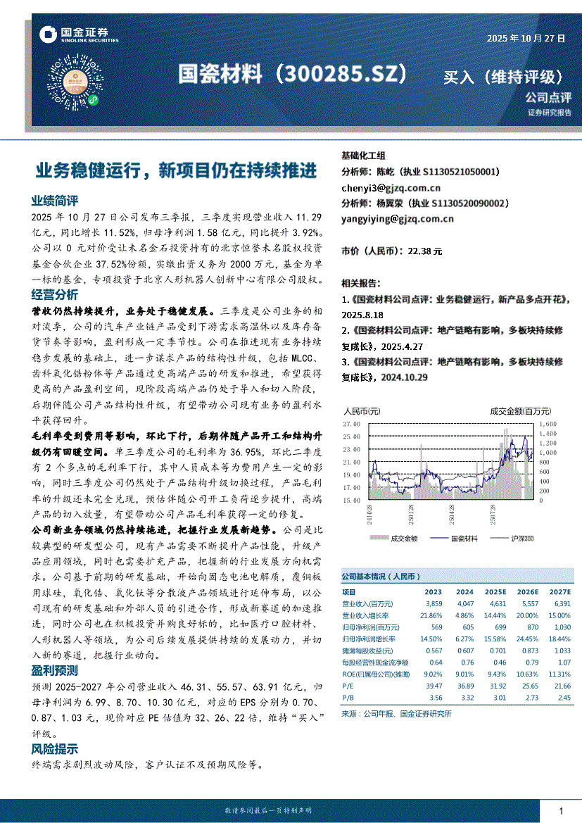 国瓷材料:国金证券-国瓷材料-300285-业务稳健运行,新项目仍在持续推进-251027