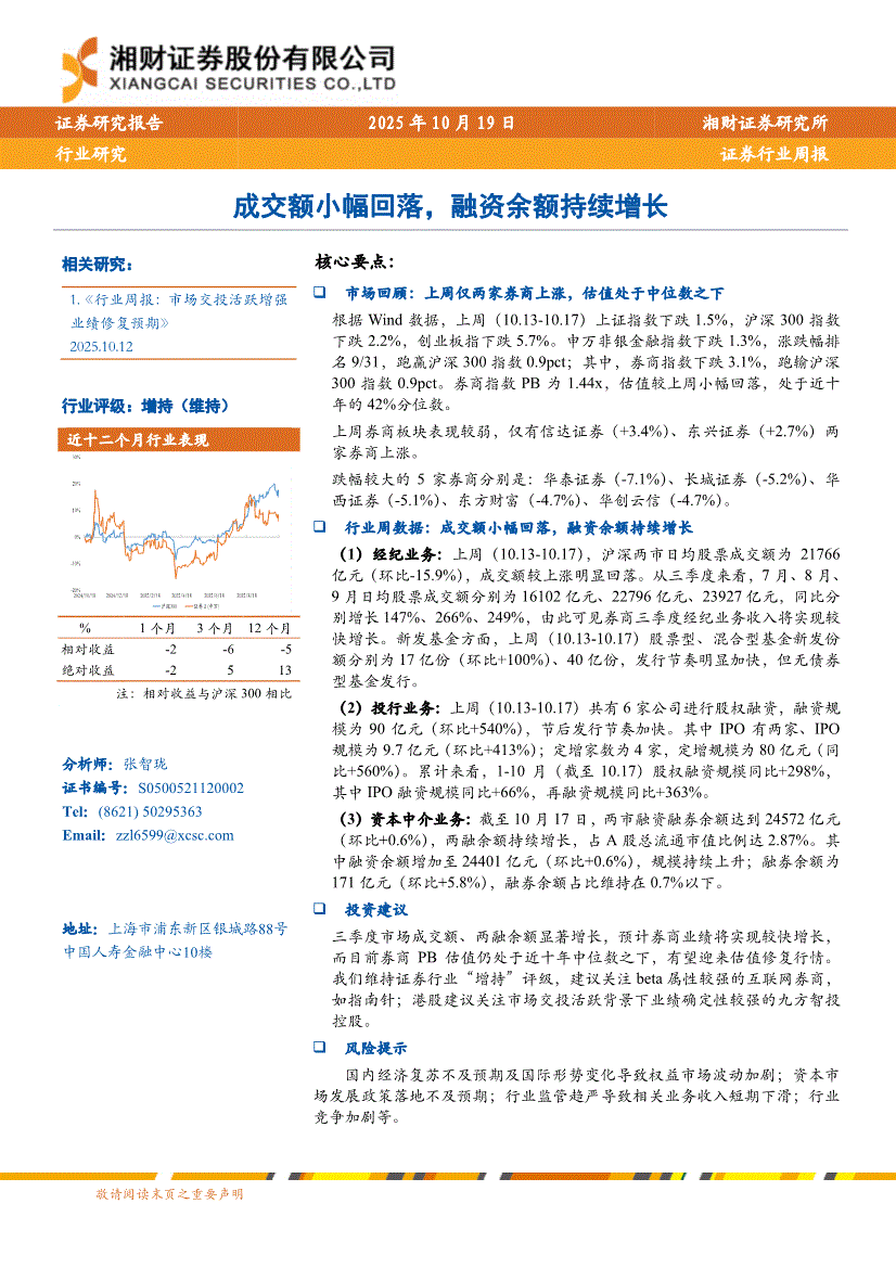 证券行业:湘财证券-证券行业周报:成交额小幅回落,融资余额持续增长-251019