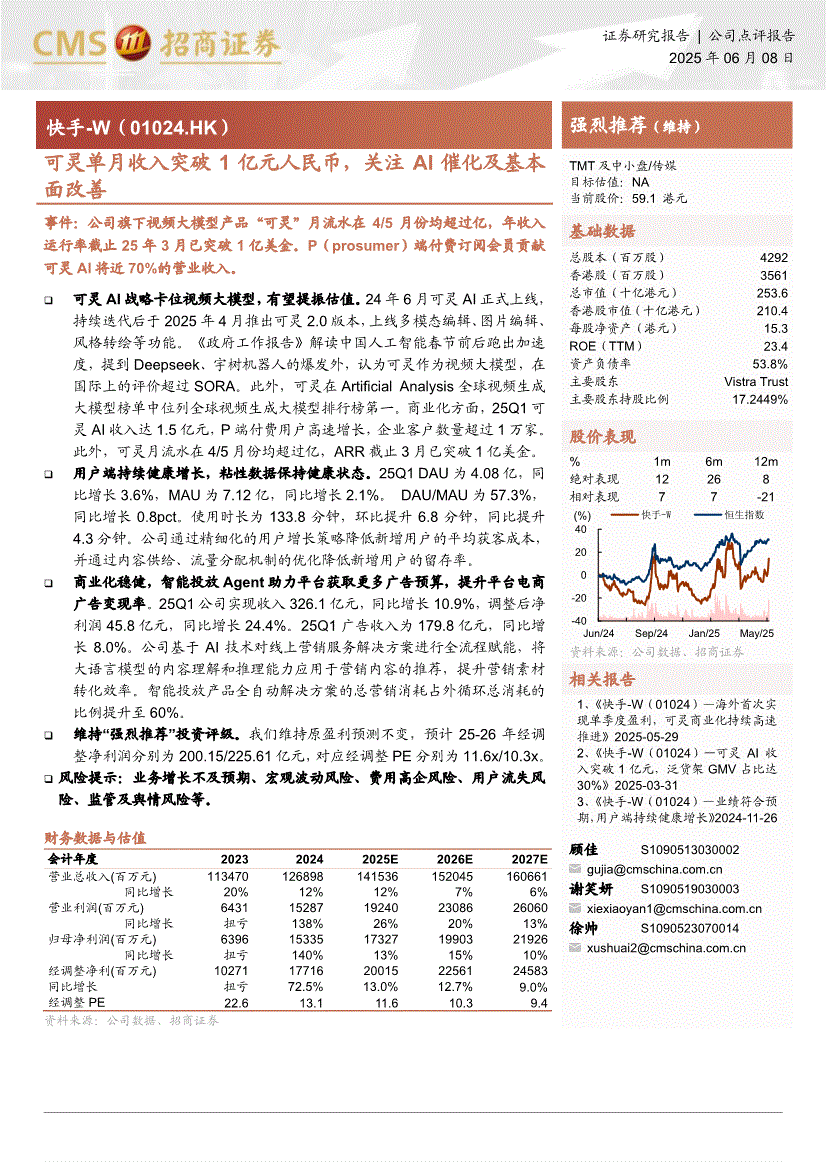 快手~W:招商证券-快手~W-1024.HK-可灵单月收入突破1亿元人民币,关注AI催化及基本面改善-250608