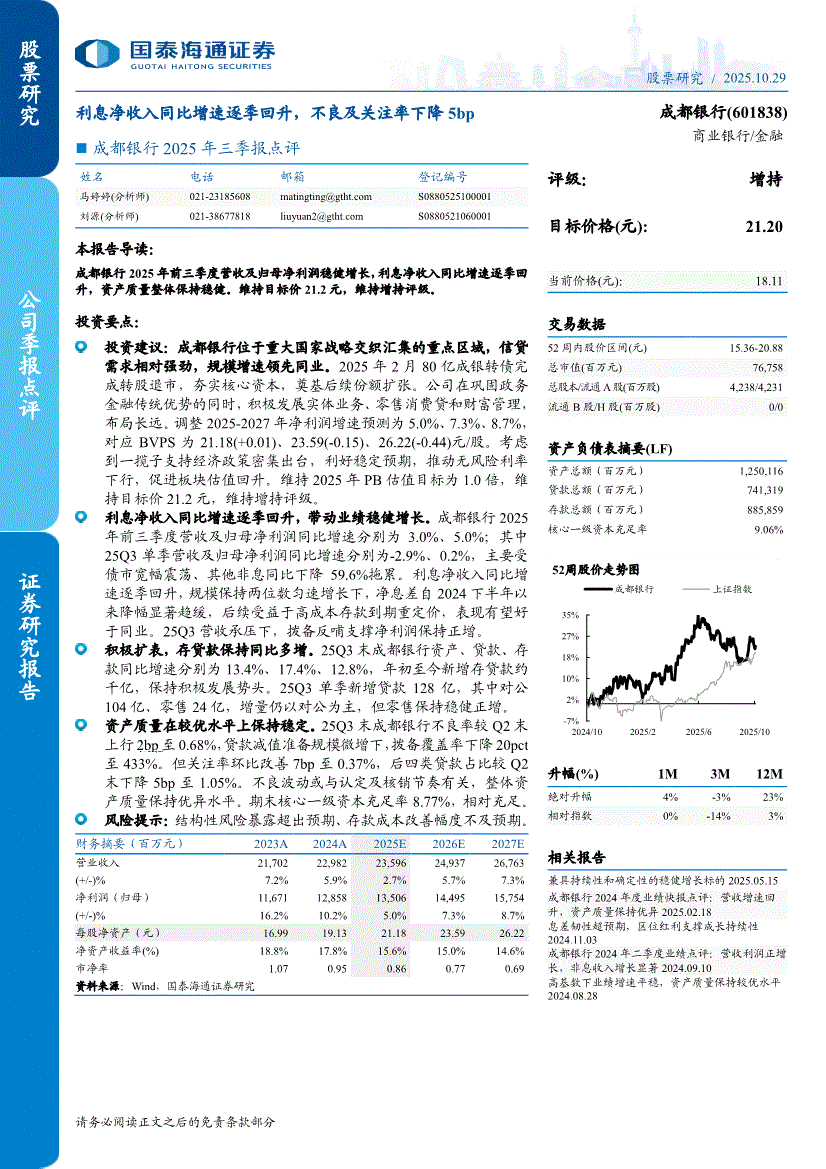 成都银行:国泰海通证券-成都银行-601838-2025年三季报点评:利息净收入同比增速逐季回升,不良及关注率下降5bp-251029