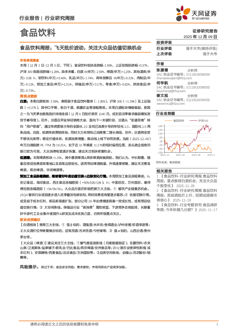 食品饮料行业:天风证券-食品饮料行业周报:飞天批价波动,关注大众品估值切换机会-251209