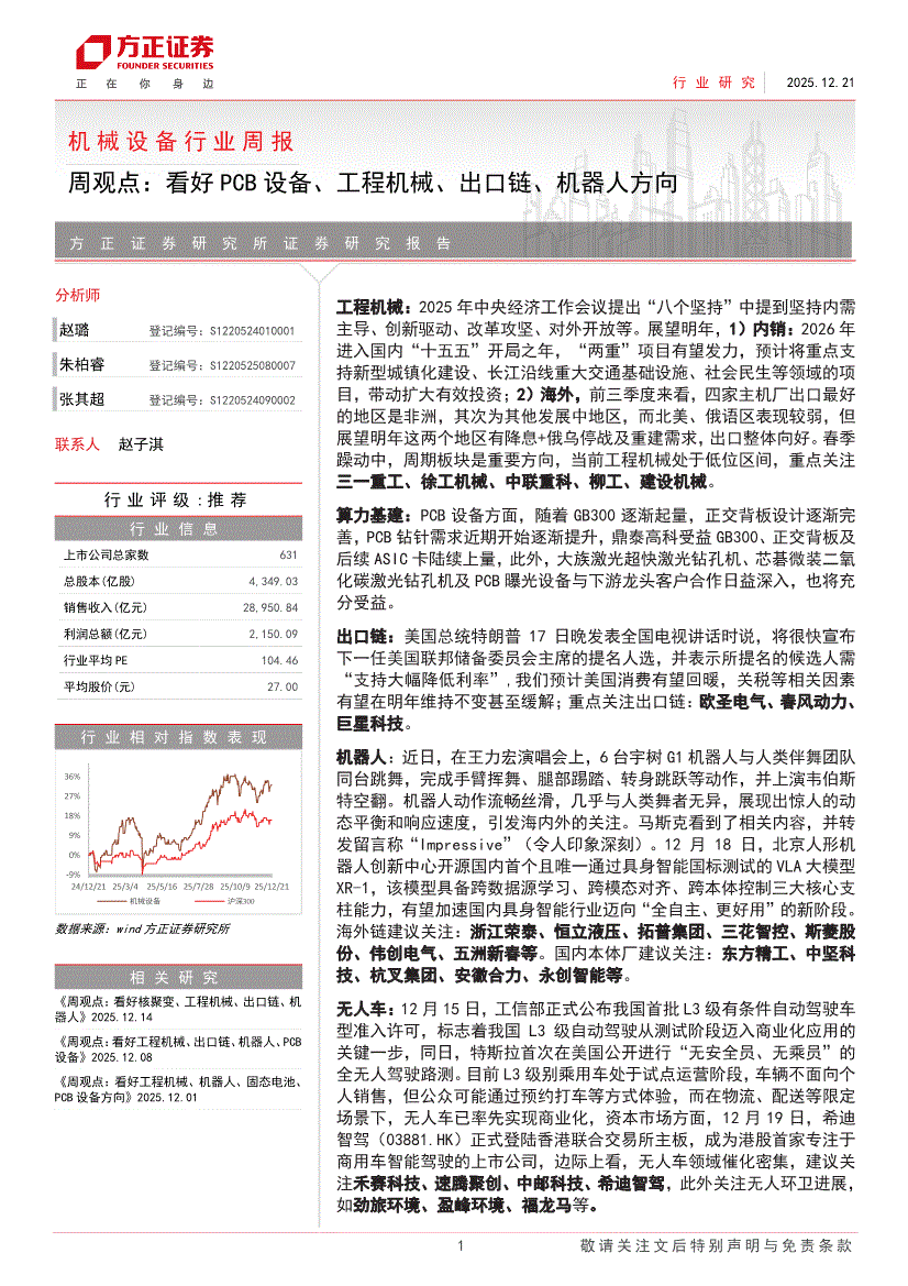 机械设备行业:方正证券-机械设备行业周报:周观点,看好PCB设备、工程机械、出口链、机器人方向-251221