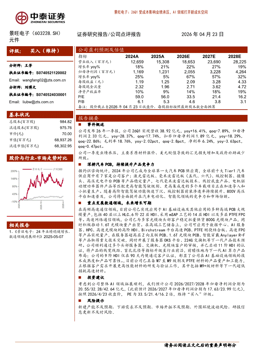 中泰证券-景旺电子-603228-26Q1受成本影响业绩承压,AI领域打开新成长空间-260423
