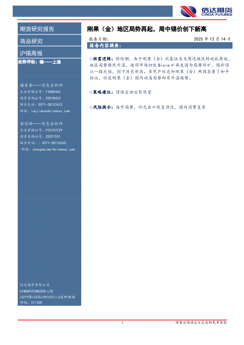 信达期货-沪锡周报:刚果(金)地区局势再起,周中锡价创下新高-251214