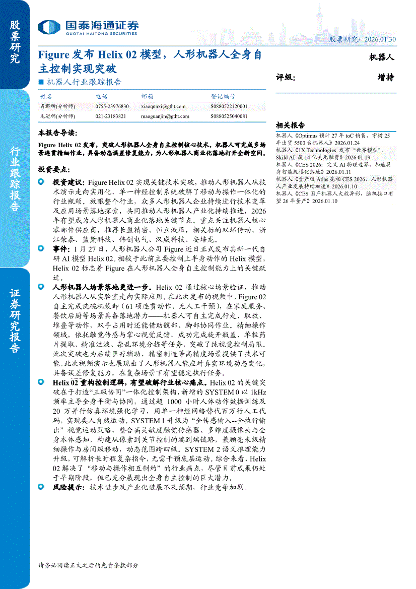 机器人行业:国泰海通证券-机器人行业跟踪报告:Figure发布Helix 02模型,人形机器人全身自主控制实现突破-260130