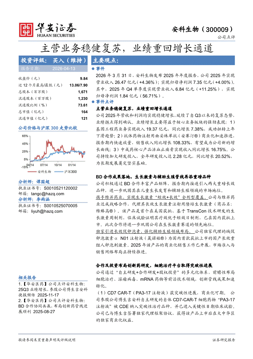 华安证券-安科生物-300009-主营业务稳健复苏,业绩重回增长通道-260413