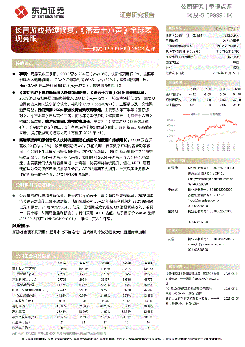 网易:东方证券-网易-9999.HK-25Q3点评:长青游戏持续修复,《燕云十六声》全球表现亮眼-251127