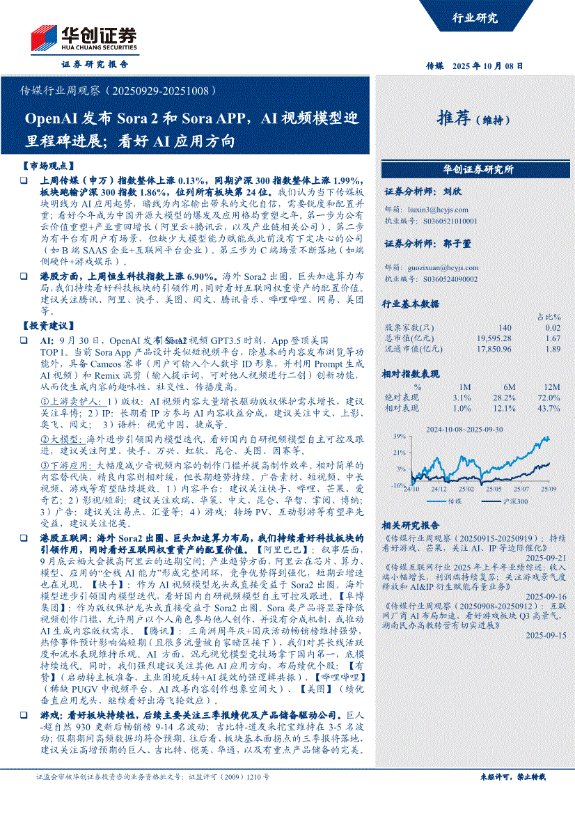 传媒行业:华创证券-传媒行业周观察:OpenAI发布Sora 2和Sora APP,AI视频模型迎里程碑进展;看好AI应用方向-251008