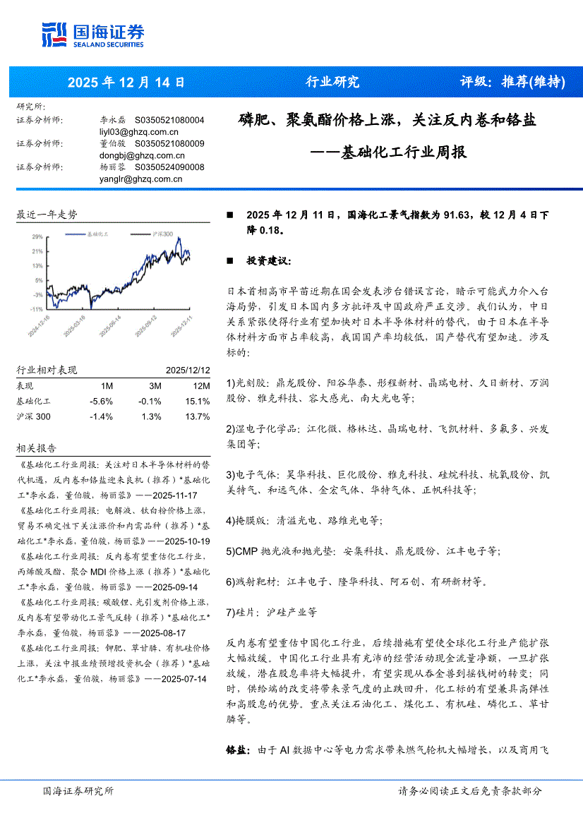 基础化工行业:国海证券-基础化工行业周报:磷肥、聚氨酯价格上涨,关注反内卷和铬盐-251214