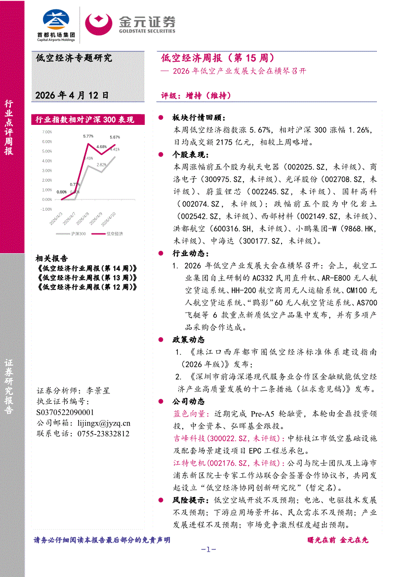 低空经济行业:金元证券-低空经济行业周报(第15周):2026年低空产业发展大会在横琴召开-260412