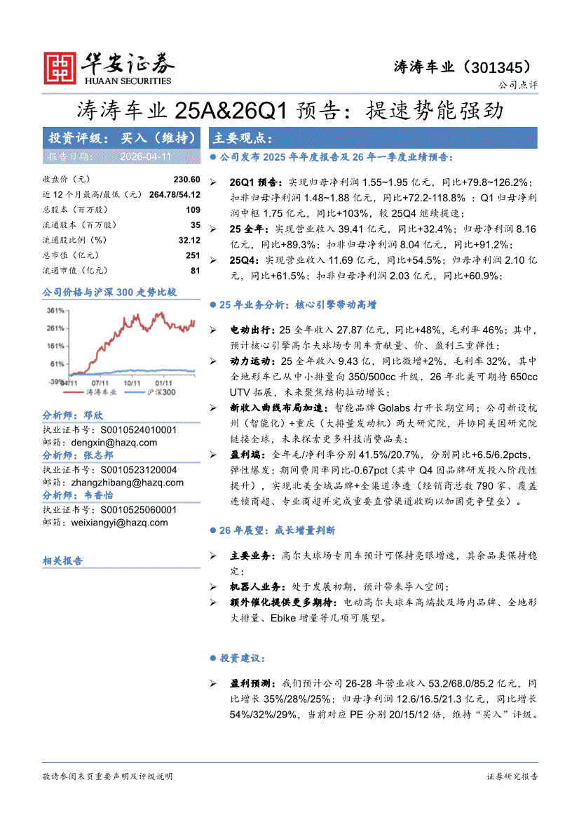 华安证券-涛涛车业-301345-25A&26Q1预告:提速势能强劲-260411