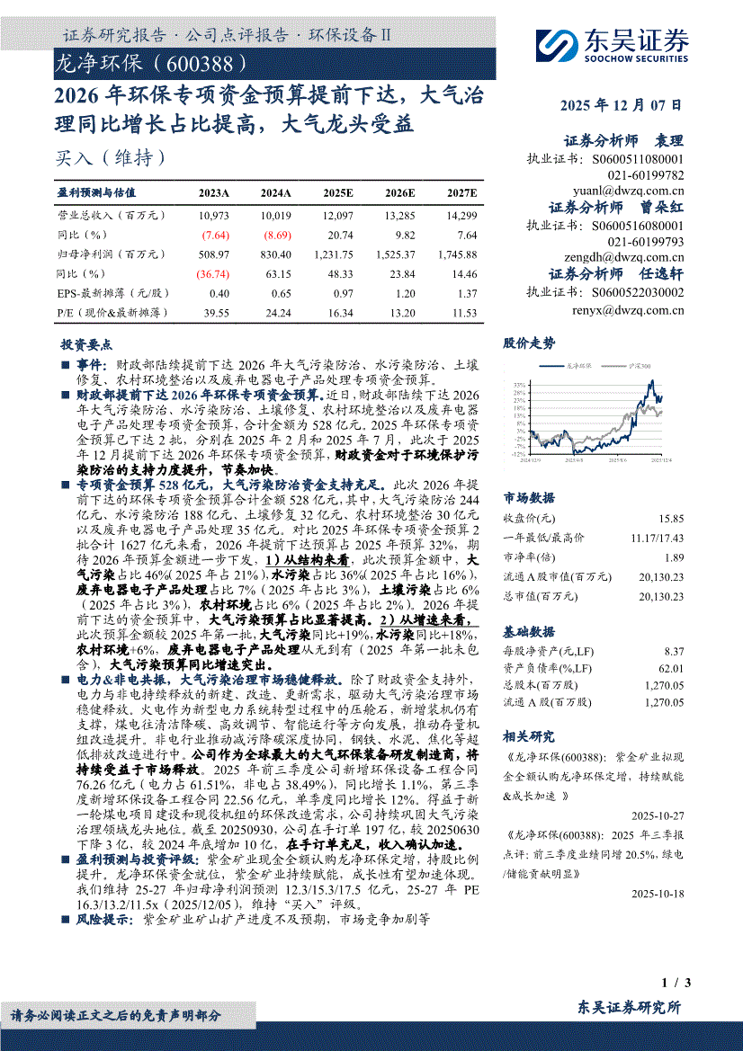 龙净环保:东吴证券-龙净环保-600388-2026年环保专项资金预算提前下达,大气治理同比增长占比提高,大气龙头受益-251207