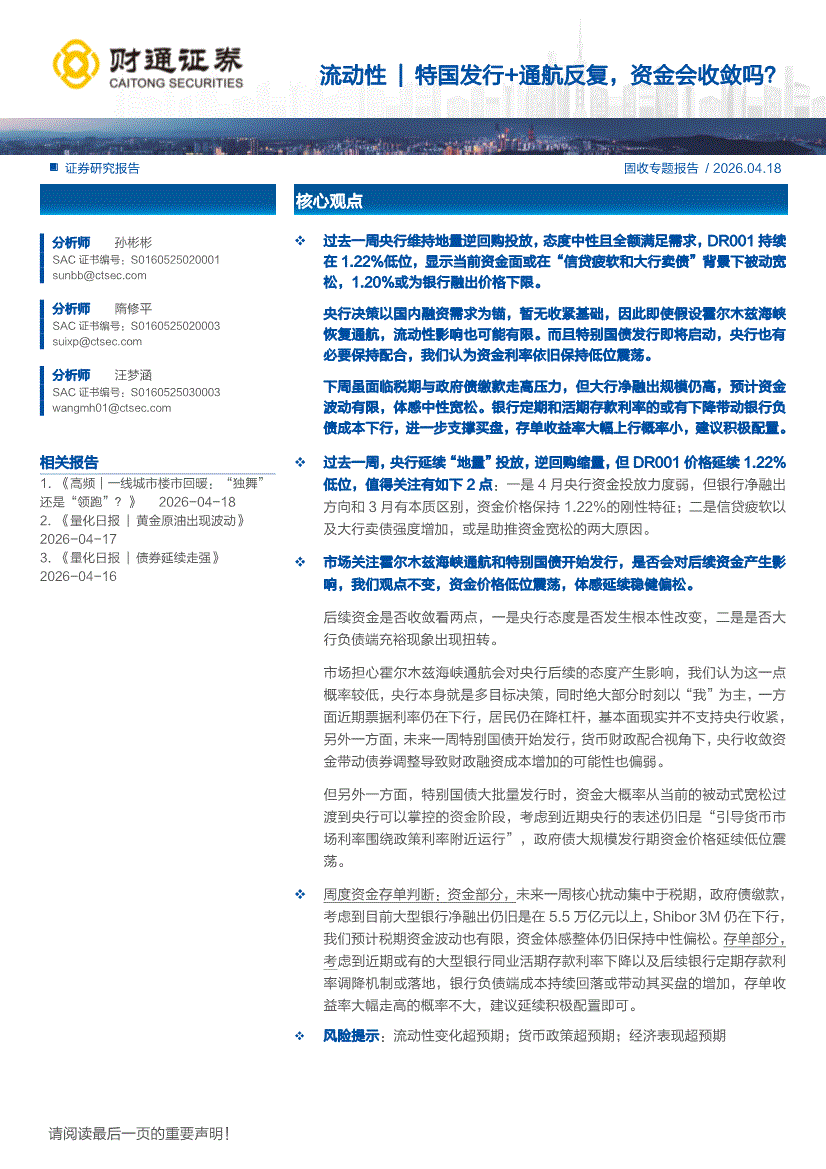 财通证券-流动性|特国发行+通航反复,资金会收敛吗?-260418
