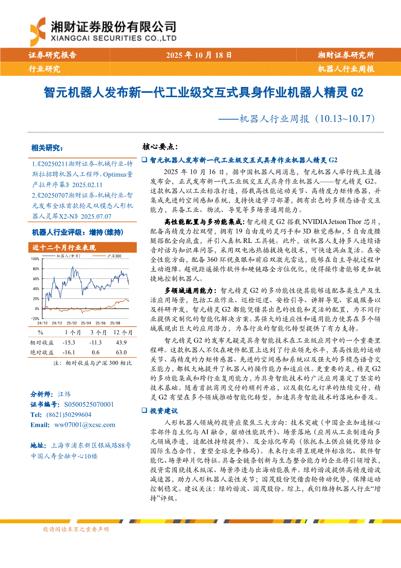 机器人行业:湘财证券-机器人行业周报:智元机器人发布新一代工业级交互式具身作业机器人精灵G2-251018