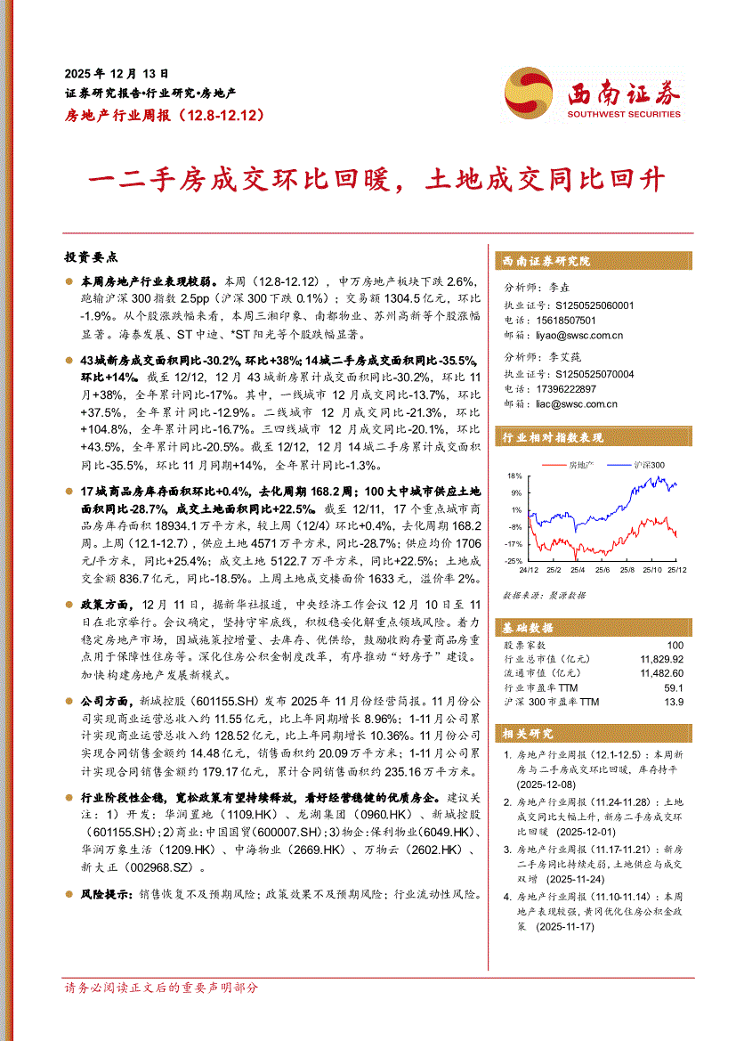 房地产行业:西南证券-房地产行业周报:一二手房成交环比回暖,土地成交同比回升-251213