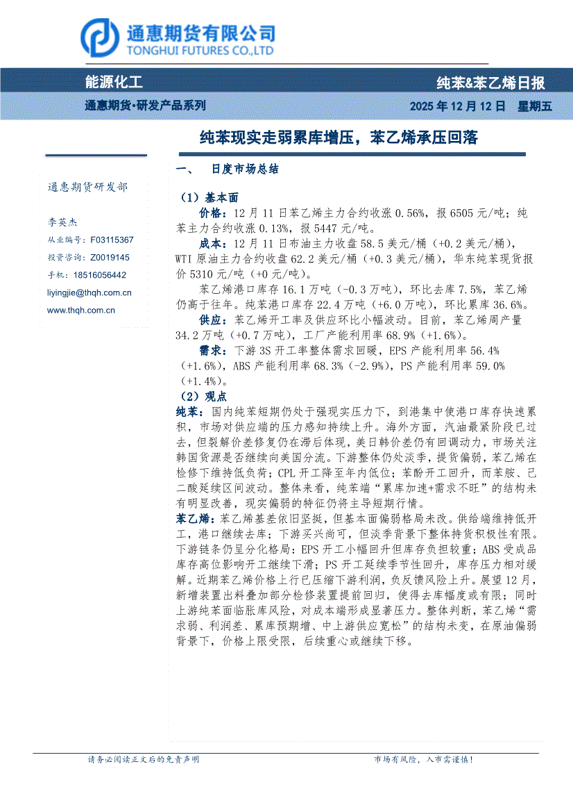 通惠期货-纯苯&苯乙烯日报:纯苯弱现实压制,苯乙烯供应回升-251205