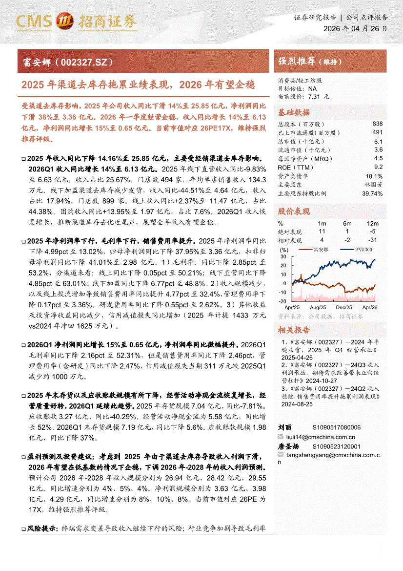 富安娜:招商证券-富安娜-002327-2025年渠道去库存拖累业绩表现,2026年有望企稳-260426