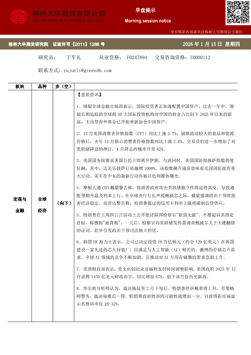 格林大华期货-早盘提示;全球经济-260121