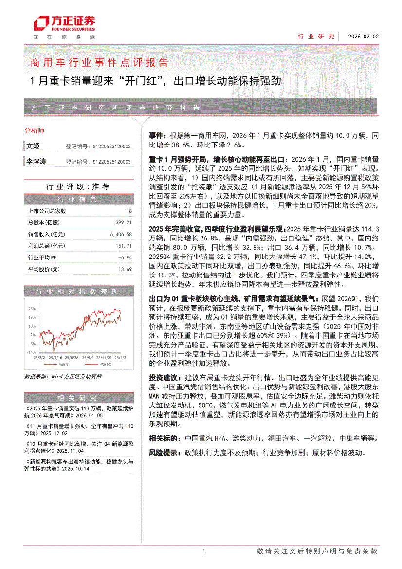 商用车行业:方正证券-商用车行业事件点评报告:1月重卡销量迎来“开门红”,出口增长动能保持强劲-260202