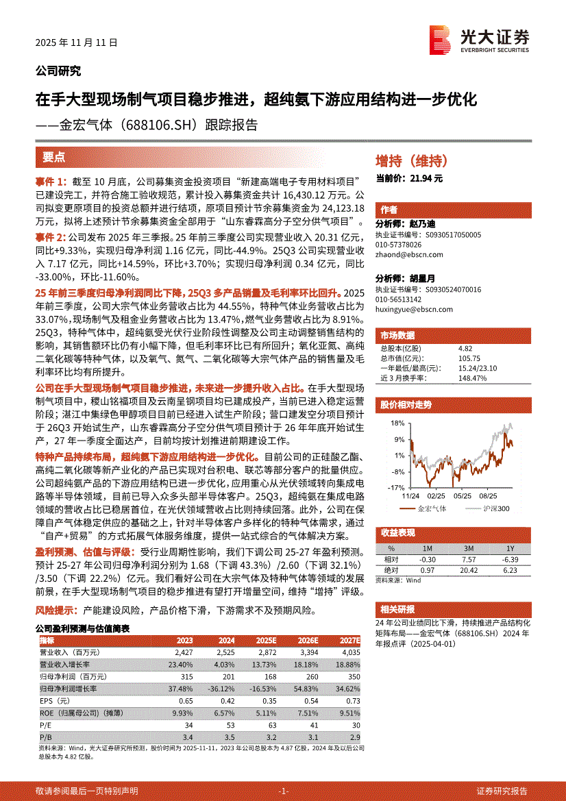 金宏气体:光大证券-金宏气体-688106-跟踪报告:在手大型现场制气项目稳步推进,超纯氨下游应用结构进一步优化-251111